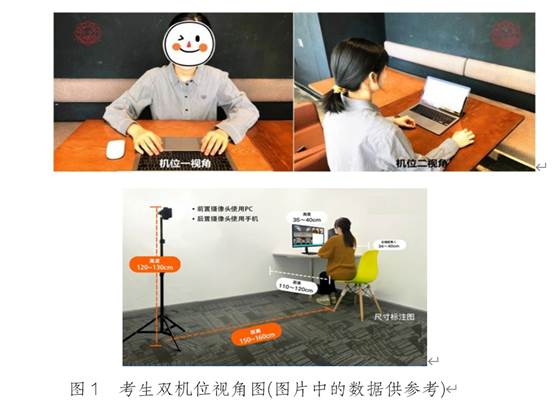 3.考生考场设立“双机位”,即主机位和副机位。主机位,主要用于回答复试专家的问题。主机位可以使用电脑带摄像头、话筒(推荐),也可以使用智能手机。副机位为考生另一部智能手机,主要用于考生考场的视频监考,要求画面清晰,手机固定于考生侧后方大致1.5米远高的位置,以视频中能显示考生及考生操作台的全景为宜(见图1)。