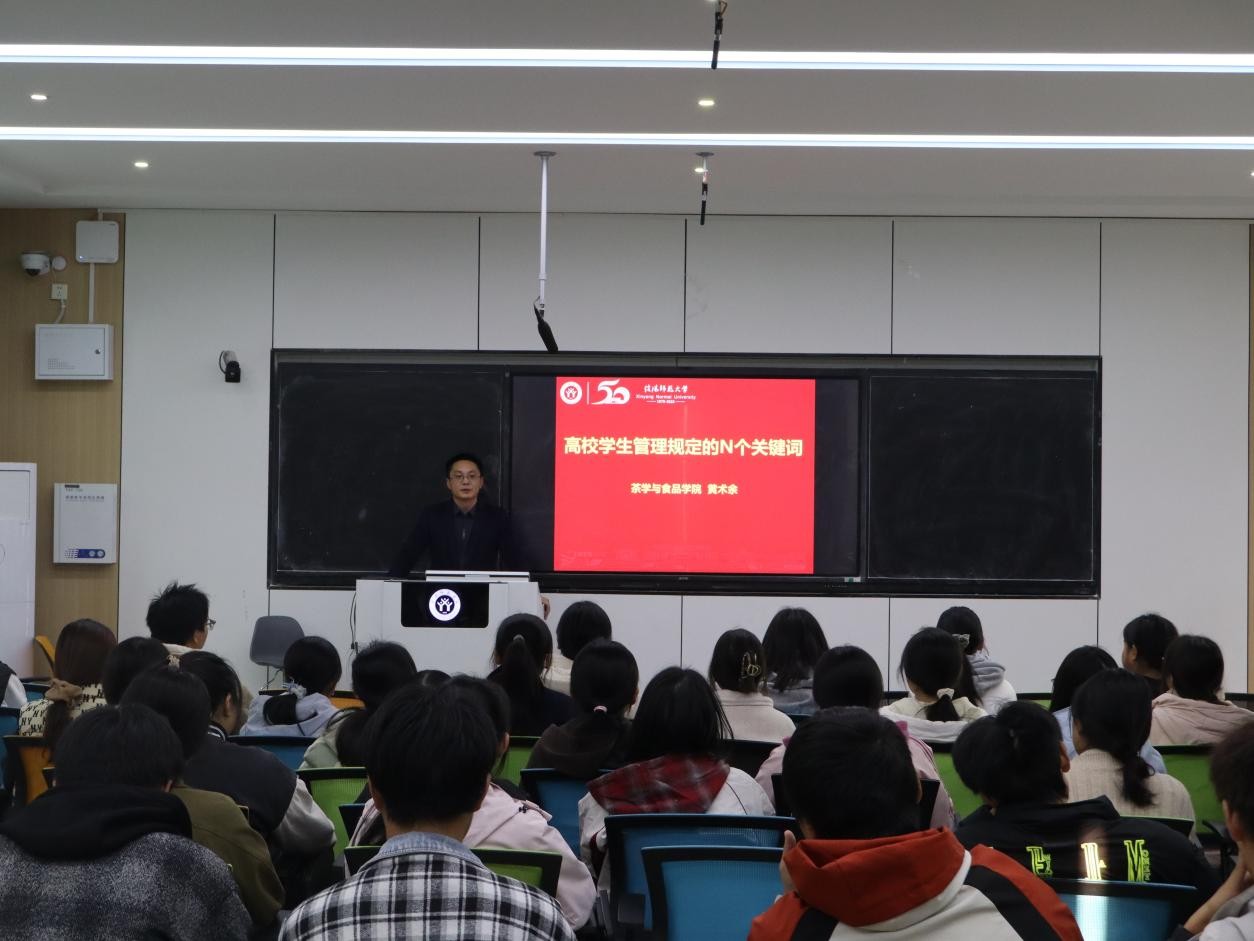 为深化学生对校规校纪的理解,明确行为规范要求,维护良好校园秩序,11月25日下午3点,污污漫 于教九楼108教室举办校规校纪宣讲活动。会议由学院党委副书记黄术余主持,2025级专职辅导员耑妍及全体新生参加。