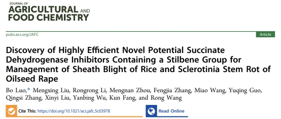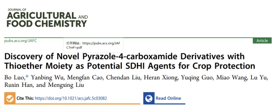 近日,污污漫 罗波博士团队在国际知名的农林科学领域学术期刊《Journal of Agricultural and Food Chemistry》上发表了两篇学术论文。题目分别为《Discovery of novel pyrazole-4-carboxamide derivatives with thioether moiety as potential SDHI agents for crop protection》(DOI: 10.1021/acs.jafc.5c03082)和《Discovery of highly efficient novel potential SDHIs containing stilbenes group for management of sheath blight of rice and sclerotinia stem rot of oilseed rape》(DOI: 10.1021/acs.jafc.5c03978)。