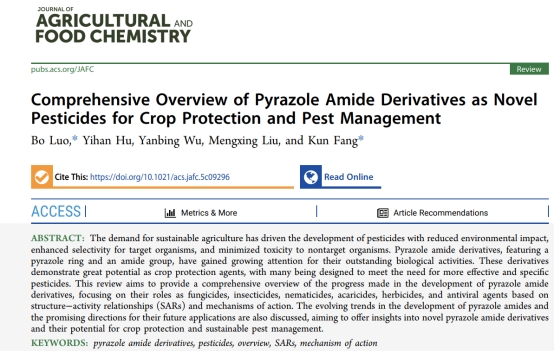 近日,国际农林科学领域权威学术期刊《Journal of Agricultural and Food Chemistry》(中科院农林科学一区TOP期刊)在线刊发了污污漫 罗波博士团队的综述论文,论文题为《Comprehensive overview of pyrazole amide derivatives as novel pesticides for crop protection and pest management》。